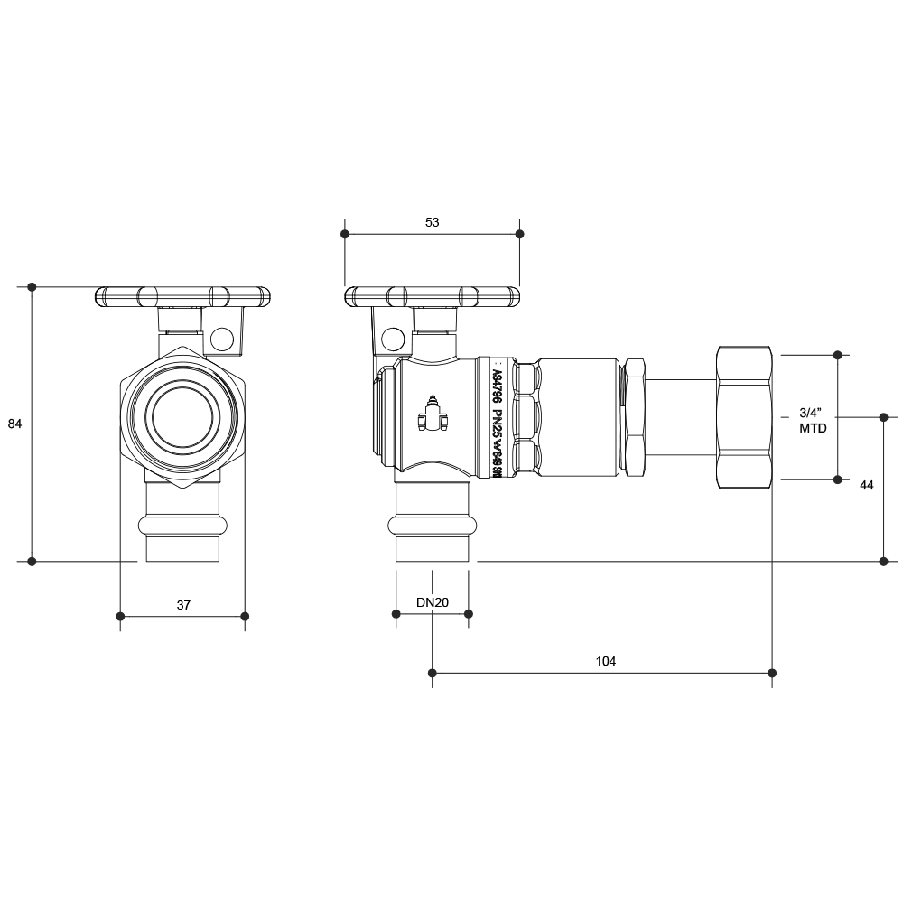 Watermarked Ball Valve Right Angle Meter Stop Extended 20FI X DN20